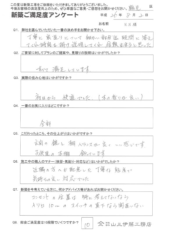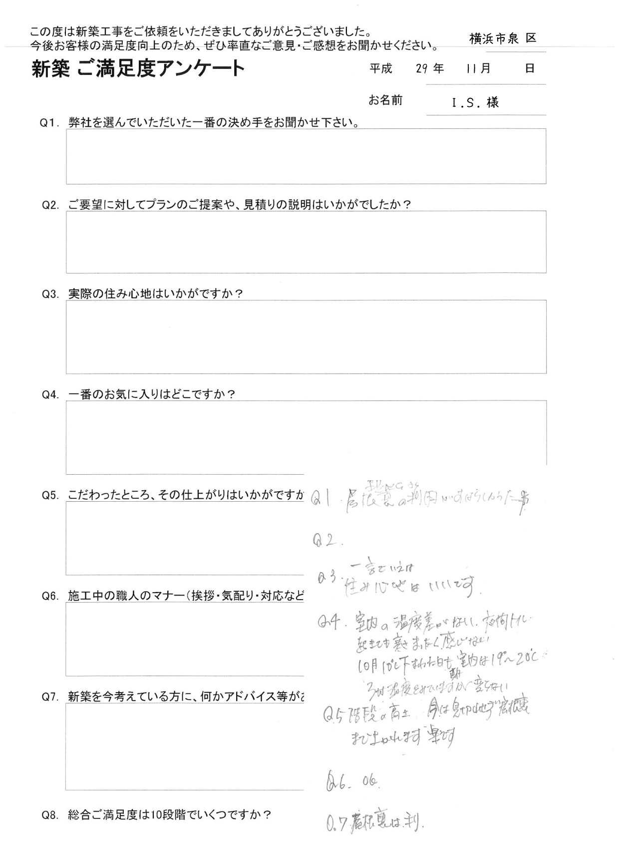 当社では、お客様と風通しの良い関係を築けるよう心掛けております。問題となる点を改善しお客様満足向上のため、より一層お役に立てるよう努力してまいります。アンケートにご協力をいただきました施主様、貴重なお声を誠にありがとうございます。